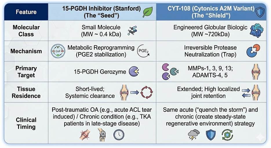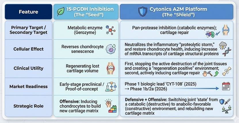 - De-risking through Differentiation: While the Stanford team targets a single metabolic pathway PGE2 stabilization, Cytonics addresses the final common pathway of cartilage destruction: the proteases themselves. Additionally, Cytonics’ lead A2M variant (“CYT-108”) has been shown to upregulate the production of critical structural components of cartilage, a complementary “rebuild” signal to PGE2 stabilization.
